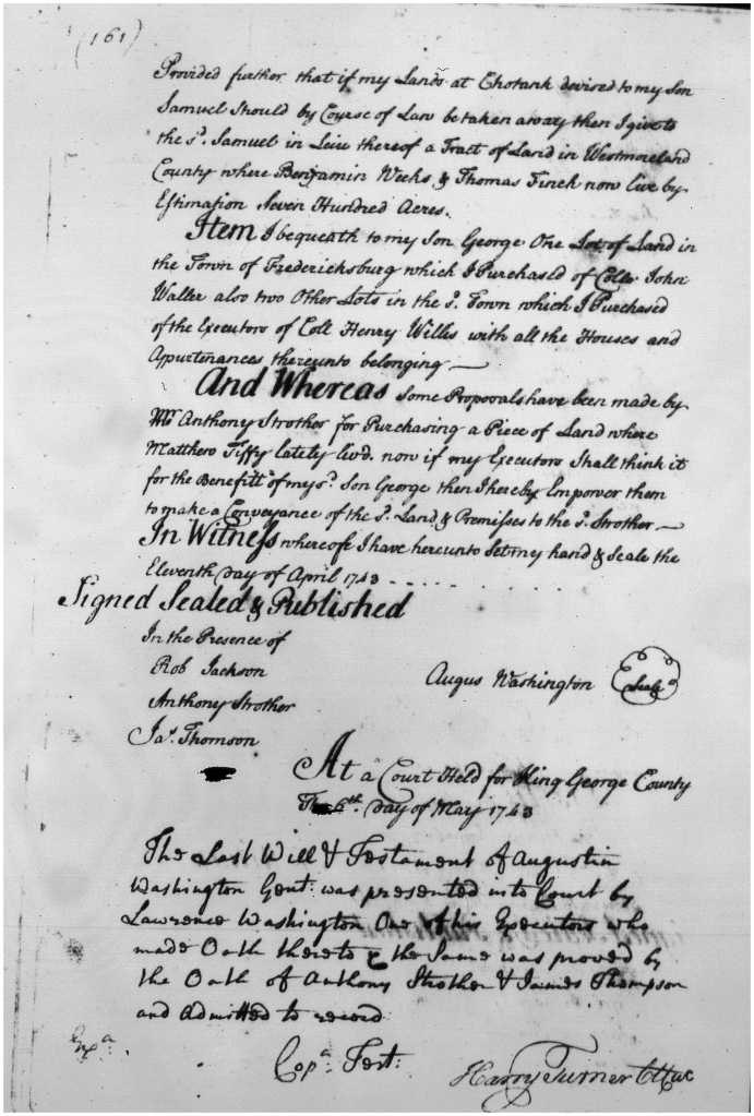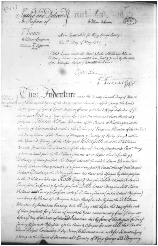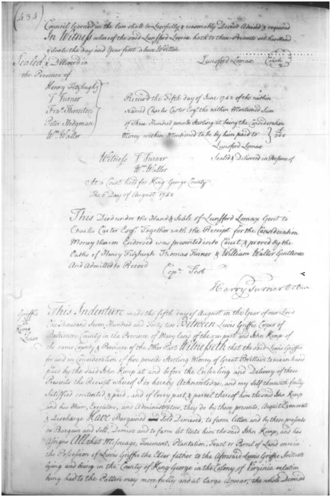 The upper section is the final wording of a deed from Lunsford Lomax Gent to Charles Carter Esq 1742. The lower section is a transaction between two men from Baltimore County, Md for land in King George County, Va. Document written by Wm Longmire.Last page of the will of Augustine Washington presented into court May 1743. Main document by Wm Longmire, bottom portion by Col Thomas Turner, and signed into record by Harry Turner, Clerk. William also amalgamated all 3 estate inventories for Augustine and entered them into record later the same year.Upper section of a lease Wm Wharton to Harry Turner sealed and delivered in presence of Thomas Turner, Wm Longmire, and Thomas Apperson May 1741. Document written by Wm Longmire and signed into record by Thomas Turner, Clerk.