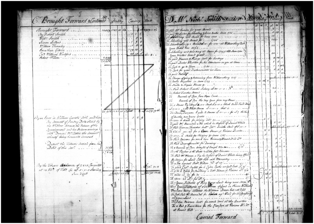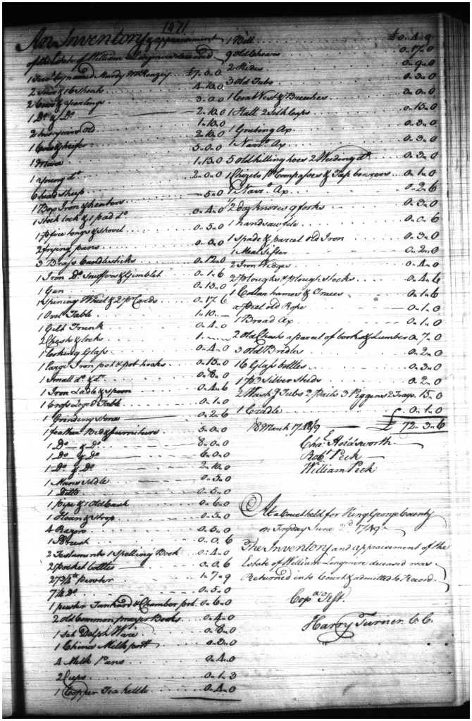 Pages 8 and 9 of the estate of Nicholas Smith – Guardian Account of daughter Elizabeth. Thomas Turner was her guardian and his son, Harry, later married Elizabeth in 1743 when she came of age. Document in the hand of Wm Longmire who also continued the account several more pages.This is an unusual inventory of sorts because it is an enumeration of goods belonging to Thomas Apperson who is turning over the contents listed above to satisfy a rent debt to Elizabeth Lomax Gentlewoman. Wm Longmire and James Scurlock swear an oath as witnesses to this effect and it is recorded on March 13, 1737/8 and entered into record. Though it appears that William has not yet begun writing court documents at this point it is interesting that he is on hand, presumably at the court house, to swear this oath. Eliza Lomax was quite a wealthy woman and her husband, John Lomax was already deceased. John Lomax was intimately involved with Thomas Turner, John Tayloe, and the Taliaferro family until his death in 1729. Thomas Apperson later appeared with William in another document (captioned above). This document was said to be the earliest reference to Wm Longmire found in the King George County records until I found a tithable list from 1730 in which he was to be paid for “watching the prison”. Here we have the estate inventory of Wm Longmire appraised by three of his neighbors. Presented into court March 18, 1748/9 it was later entered into record in June 1749. In the original court order for the appraisal Joel Berry was also appointed with the Pecks and Charles Holdsworth. The value of William’s estate and types of implements and housewares put him at the upper end of the middle class – a far cry from his ignominious beginnings. And though this list is quite expansive in scope from owning a looking glass, forks and knives, 4 beds and furniture, a servant boy, books, and several farm and other kitchen implements, it is somewhat curious to this writer what is missing: William’s writing instruments and the large amounts of clothe and associated sewing items routinely purchased on his store account. Could his wife’s possible autonomy and ownership privileges regarding William’s store account be a clue perhaps as to her background before marriage? After William’s death Susannah Longmire not only settled an account with William Parker – Taylor but she also continued to purchase clothe on her husband’s account for a short time. This and the fact that no court record showing her children being adjudicated at the Orphans Court may indicate an undiscovered family network.